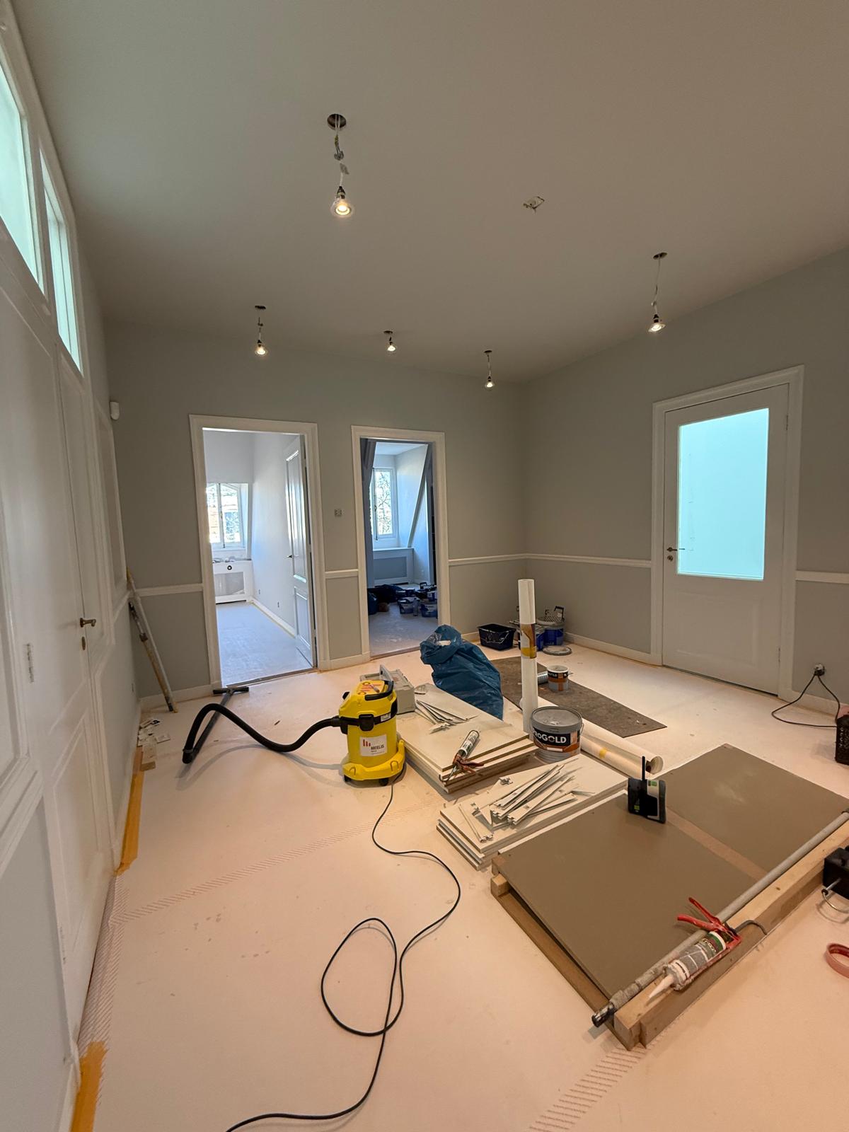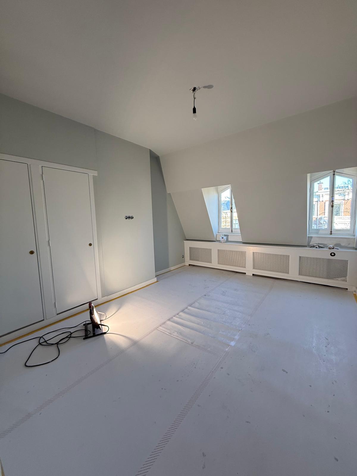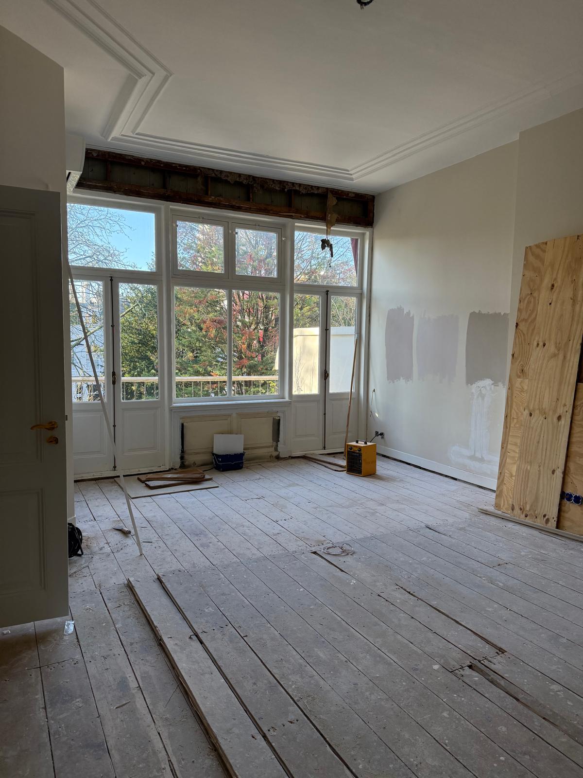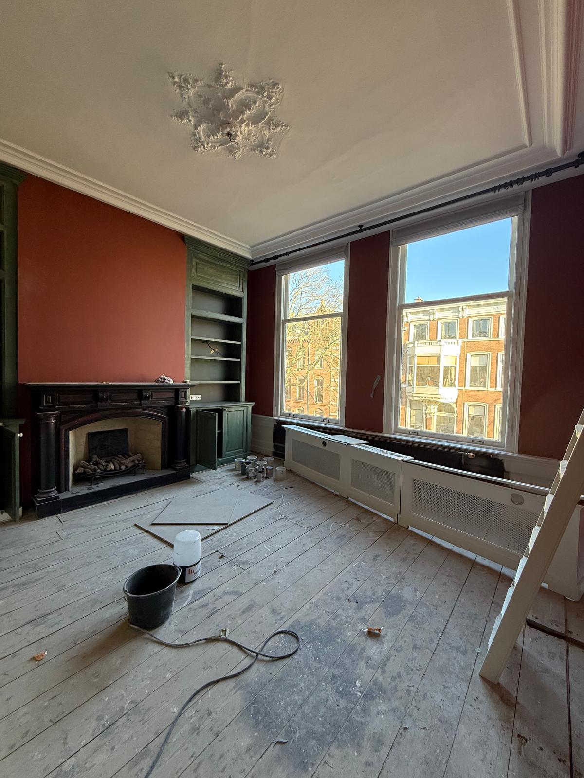 Je ziet hier een renovatie van begin tot eind. Van sloopwerk en kale ruimtes tot strak afgewerkte vertrekken. De vloeren zijn volledig aangepakt met nieuwe onderlagen en een visgraat parketvloer. Wanden en plafonds zijn hersteld en strak afgewerkt met spuitwerk uit eigen werkplaats. Ornamenten, hoge plafonds en klassieke details zijn behouden en opnieuw tot hun recht gebracht.