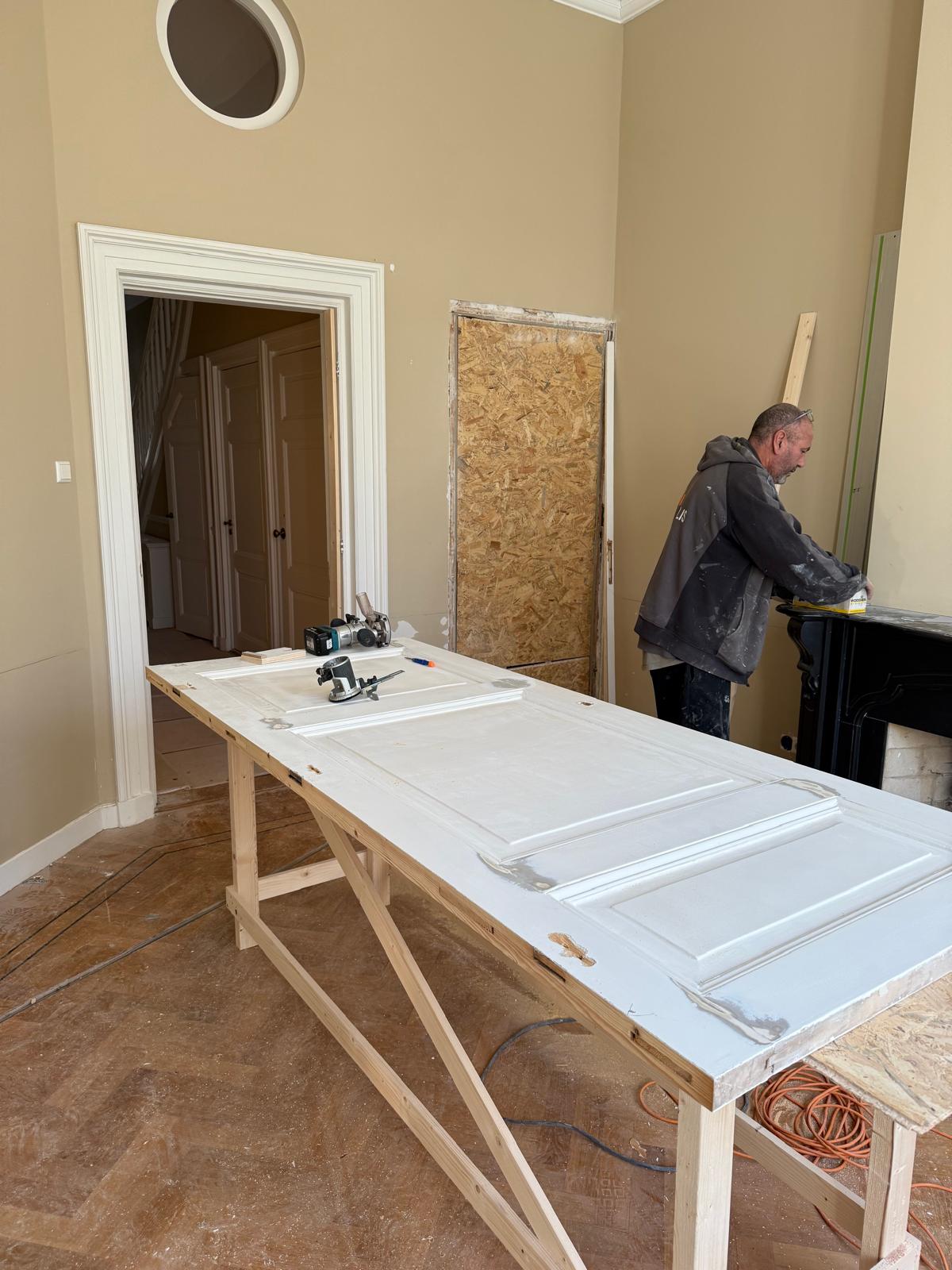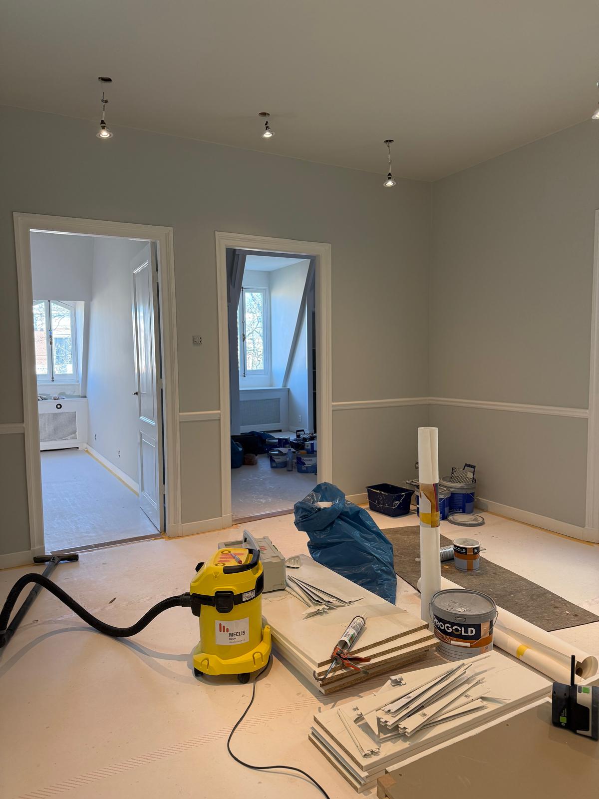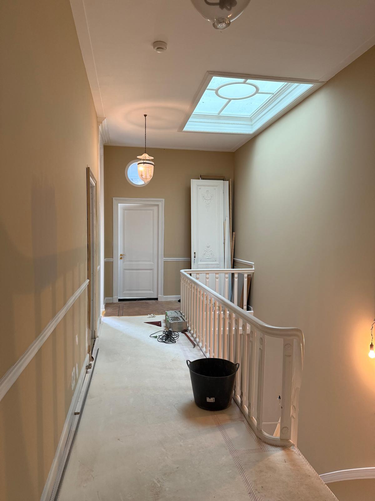 Je ziet hier een renovatie van begin tot eind. Van sloopwerk en kale ruimtes tot strak afgewerkte vertrekken. De vloeren zijn volledig aangepakt met nieuwe onderlagen en een visgraat parketvloer. Wanden en plafonds zijn hersteld en strak afgewerkt met spuitwerk uit eigen werkplaats. Ornamenten, hoge plafonds en klassieke details zijn behouden en opnieuw tot hun recht gebracht.