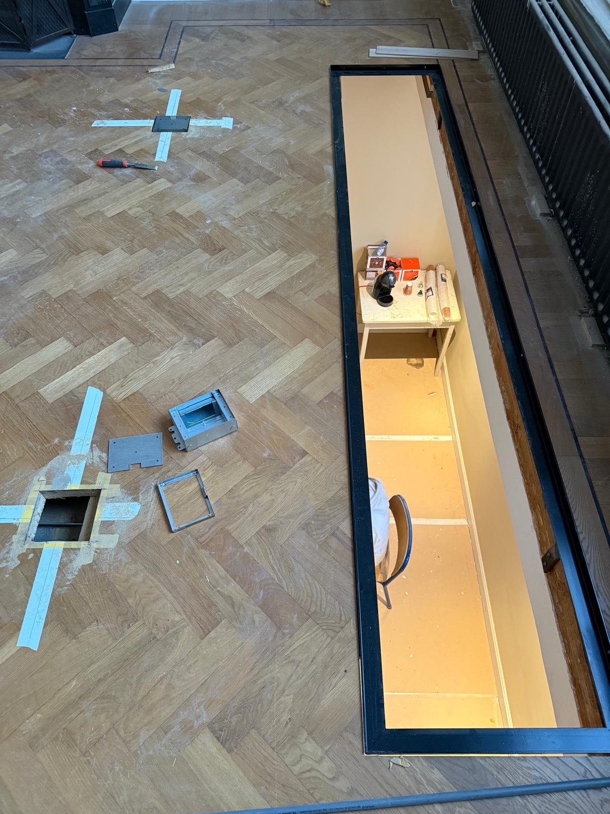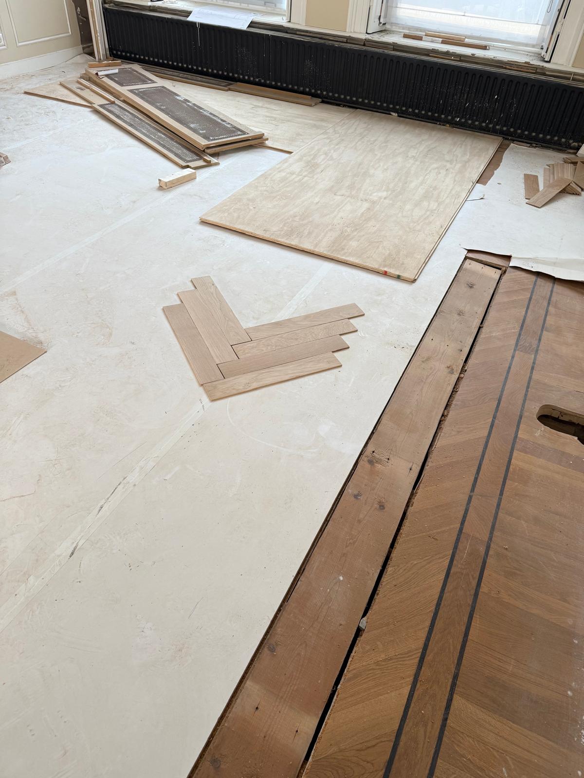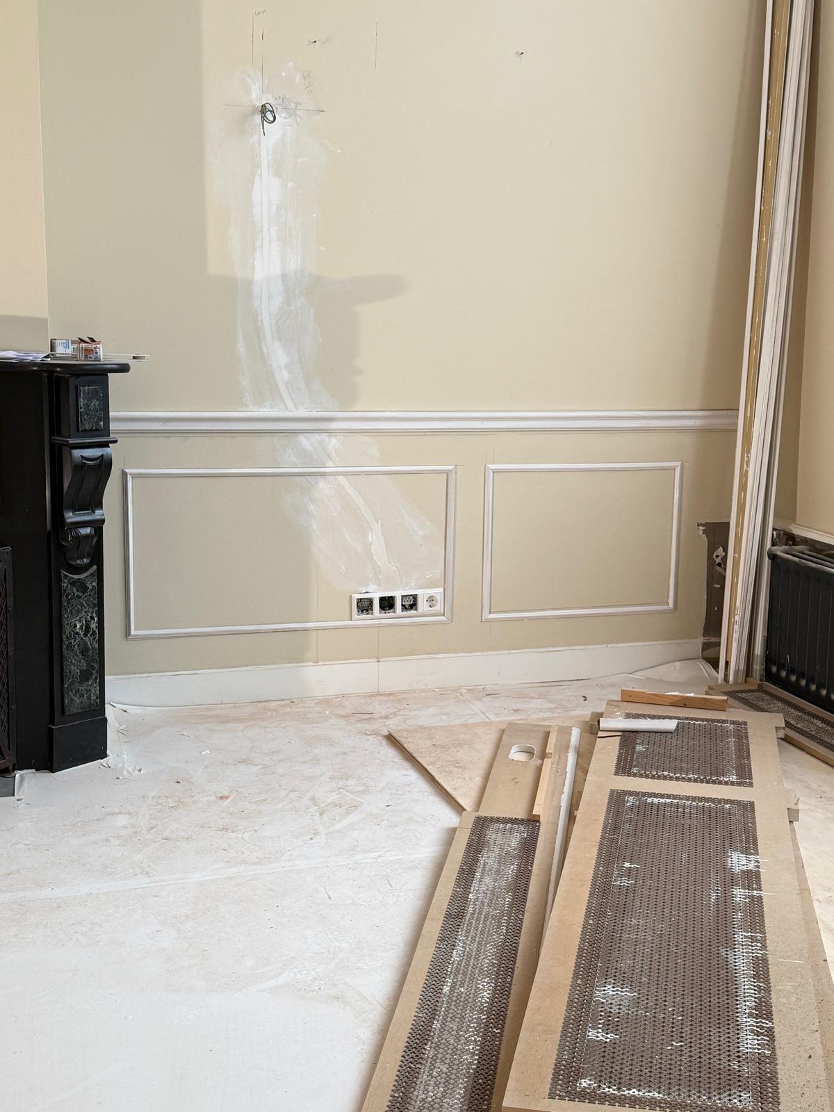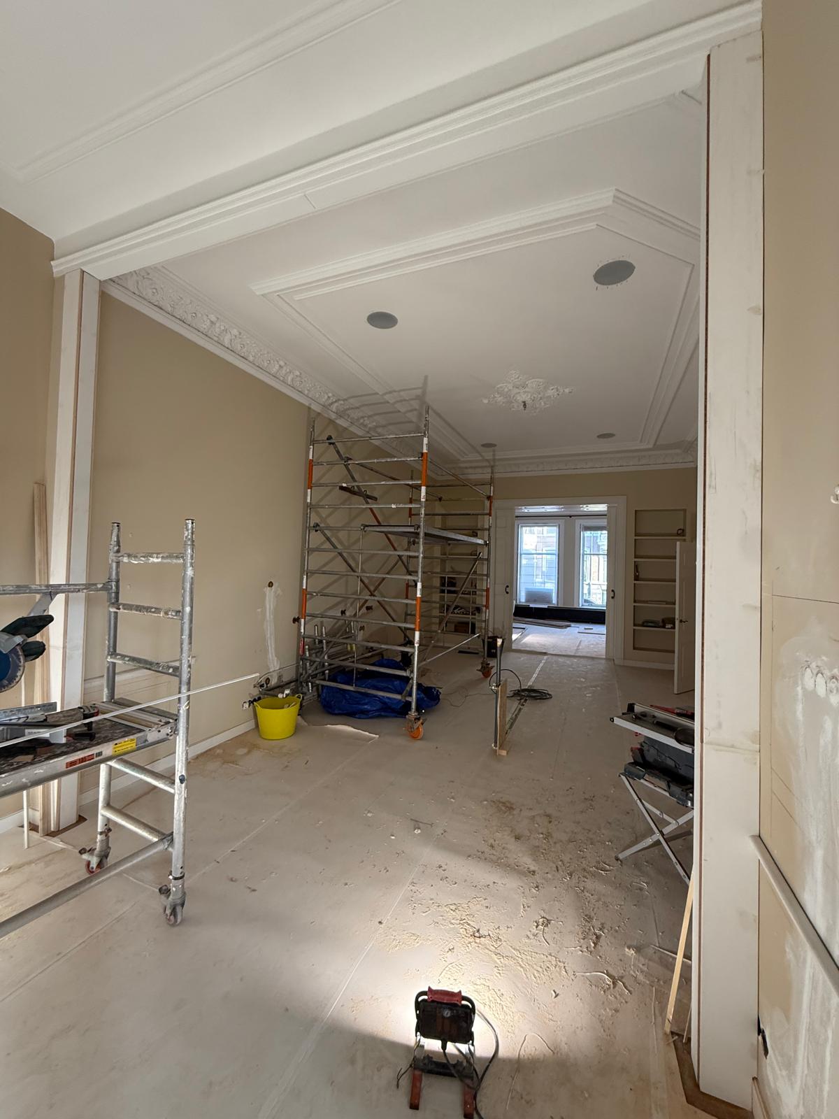 Je ziet hier een renovatie van begin tot eind. Van sloopwerk en kale ruimtes tot strak afgewerkte vertrekken. De vloeren zijn volledig aangepakt met nieuwe onderlagen en een visgraat parketvloer. Wanden en plafonds zijn hersteld en strak afgewerkt met spuitwerk uit eigen werkplaats. Ornamenten, hoge plafonds en klassieke details zijn behouden en opnieuw tot hun recht gebracht.